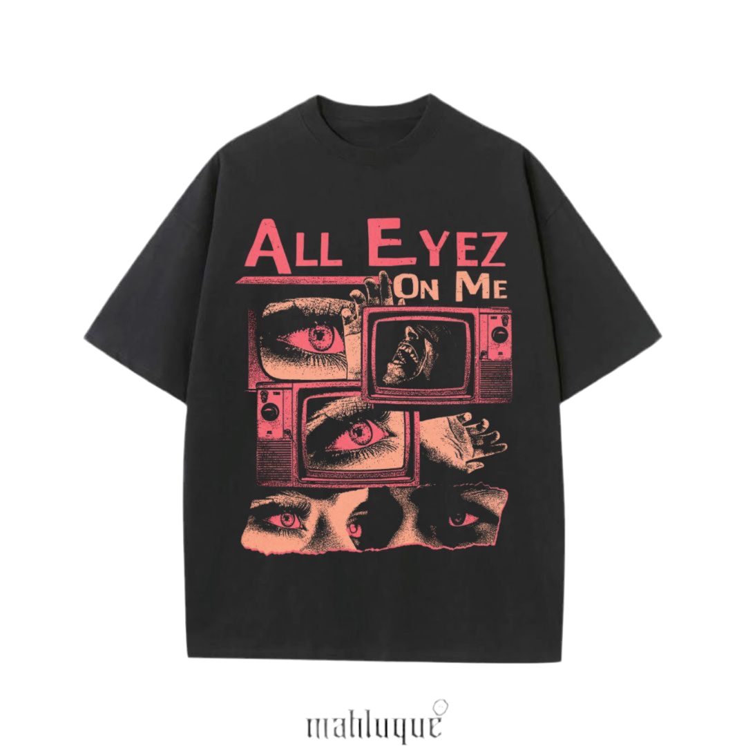 Dikkatler üzerinde, bakışlar hep sende. All Eyez On Me Oversize T-shirt; televizyon ekranlarına hapsolmuş göz illüstrasyonlarıyla modern toplumun gözetlenme hissine gönderme yapıyor. Sokak stiline distopik bir hava katmak isteyenler için etkileyici bir tercih.