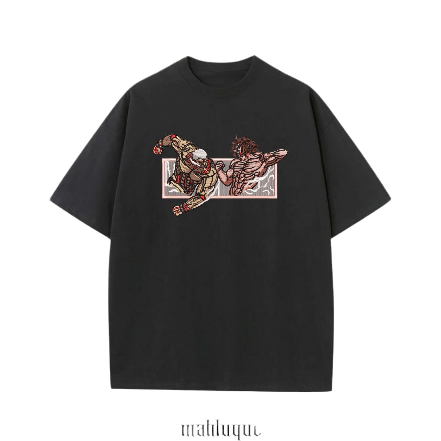 İhanetle adaletin, geçmişle intikamın çarpıştığı an: Titan Clash Oversize T-shirt efsanevi bir yüzleşmeyi taşıyor. Attack on Titan evreninin en ikonik savaş sahnesinden ilham alan bu tasarım, iki dev karakterin karşı karşıya gelişini güçlü bir grafikle sunuyor.