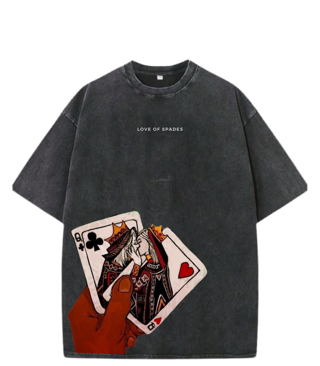 Aşkın kartlarla anlatıldığı, kuralların yeniden yazıldığı bir tasarım: Love of Spades. Asit yıkamalı bu oversize tişört, klasik iskambil figürlerini modern bir aşk hikayesine dönüştürüyor. Kupa ve sinek kraliçelerinin yasak bir öpücükle buluştuğu bu tasarım, hem görsel gücüyle hem de verdiği mesajla dikkat çekiyor.