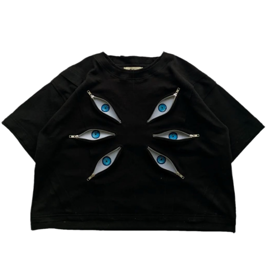 Gözetleniyorsun… ama bu kez senin tarafın güçte. Gojo’s Eyes Zipper Edition T-shirt, Jujutsu Kaisen evreninin en ikonik karakterlerinden Satoru Gojo’nun gözlerinden ilham alıyor. Her biri fermuarla açılıp kapanabilen göz detayları, hem fiziksel hem metaforik olarak dikkat çekiyor: kontrol sende.