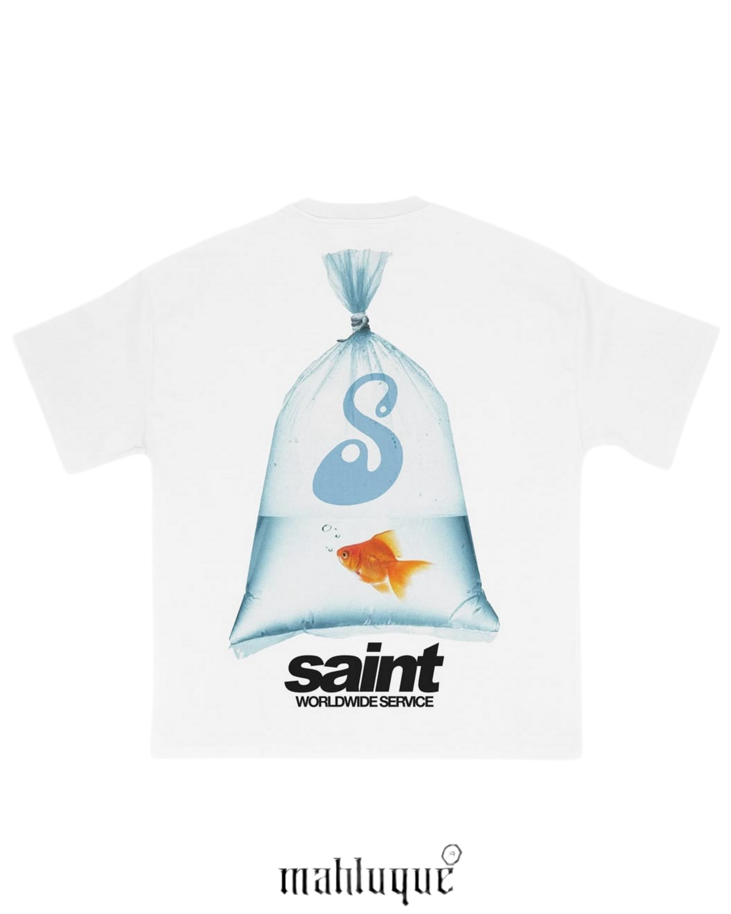 Modern dünyada bir fanusun içinde hayatta kalmaya çalışan altın bir balık gibi hissediyor musun? Mahluque’un S Fish Tee tasarımı tam da bunu temsil ediyor. Şeffaf su torbası içinde özgürlükle sınır arasında sıkışmış bir balık ve üzerinde zarif bir “S” logosu… Altında ise her yerde hizmette: Saint Worldwide Service.